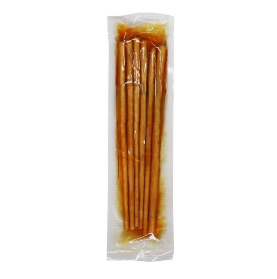 這道小吃選用宮崎縣的牛蒡根,並以經典的日式醬油調味。此外,還使用了鹿兒島縣 - 福山町伊達酒造(創立於1260年,是黑醋的發源地)出產的黑醋,並採用低溫慢醃工藝,濃縮風味。這道小吃與啤酒、燒酎、葡萄酒、清酒及其他酒類飲品非常搭配。可常溫保存,方便作為輕食享用。